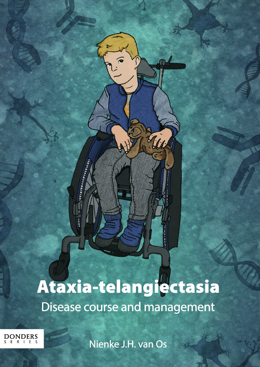 Aangezien de meeste patiënten met de klassieke vorm van A-T overlijden voordat ze de leeftijd van 30 jaar bereiken, zijn diegene die langer dan 30 jaar leven relatief oude patiënten met A-T. In hoofdstuk 2 wordt het fenotype van deze groep beschreven. Hiervoor zijn gegevens van zeven patiënten uit het Nederlandse cohort gecombineerd met gegevens van 14 patiënten die in de wetenschappelijke literatuur zijn beschreven. Het blijkt dat klassiek A-T, ook in het eindstadium, een ernstige en progressieve multisysteemziekte is. Patiënten ervaren problemen in zowel fysieke en functionele, als psychosociale domeinen. Het neurologische beeld van deze oudere patiënten wordt gekenmerkt door een progressieve neuropathie met voorhoornlijden. Cerebellaire ataxie en extrapiramidale bewegingsstoornissen zijn bij deze groep niet evident aanwezig. Daarnaast verliezen deze patiënten hun willekeurige motoriek, wat resulteert in een tetraparese en een ‘hangend hoofd’. De meeste problemen bij oudere patiënten met klassiek A-T zijn het resultaat van de voortijdige veroudering die ontstaat door het onderliggende DNA-hersteldefect. Omdat de meeste oudere patiënten met klassiek A-T in deze studie zich terugtrokken van screening en medische zorg, en omdat het aantal beschrijvingen van oude patiënten in de literatuur beperkt was, zijn toekomstige studies nodig om meer inzicht te krijgen in de omvang van deze problemen en ter optimalisatie van preventie, counseling en (palliatieve) zorg. Bij oudere patiënten met klassiek A-T moeten keuzes omtrent levensverlengende behandelingen met de patiënten samen besproken worden.